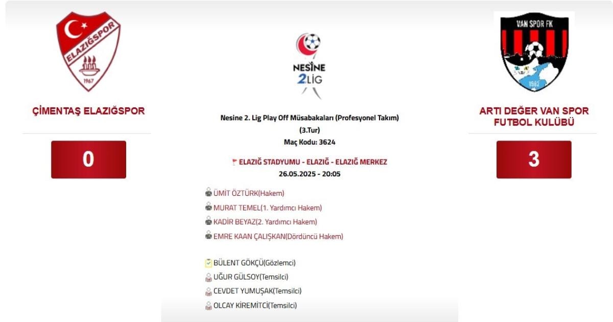 2. Lig Play-Off 3. turunda Elazığspor ile Vanspor FK arasında oynanan ve 56. dakikada yardımcı hakeme isabet eden yabancı madde nedeniyle hakem Ümit Öztürk tarafından tatil edilen maçın sonucu tescillendi.