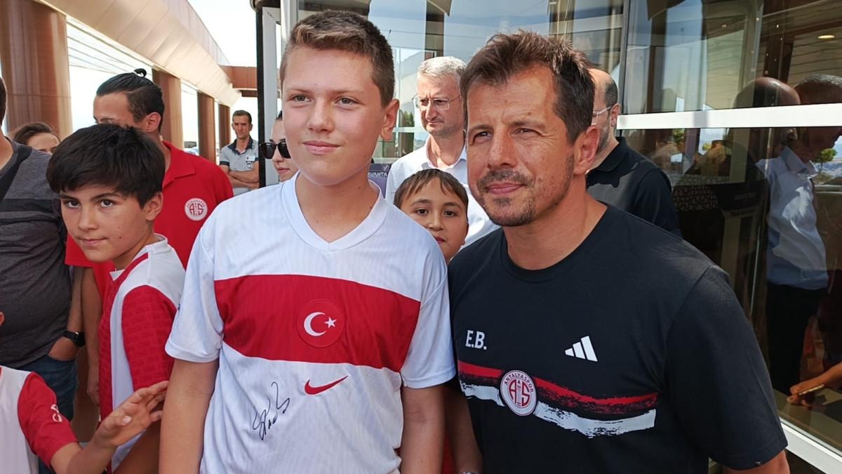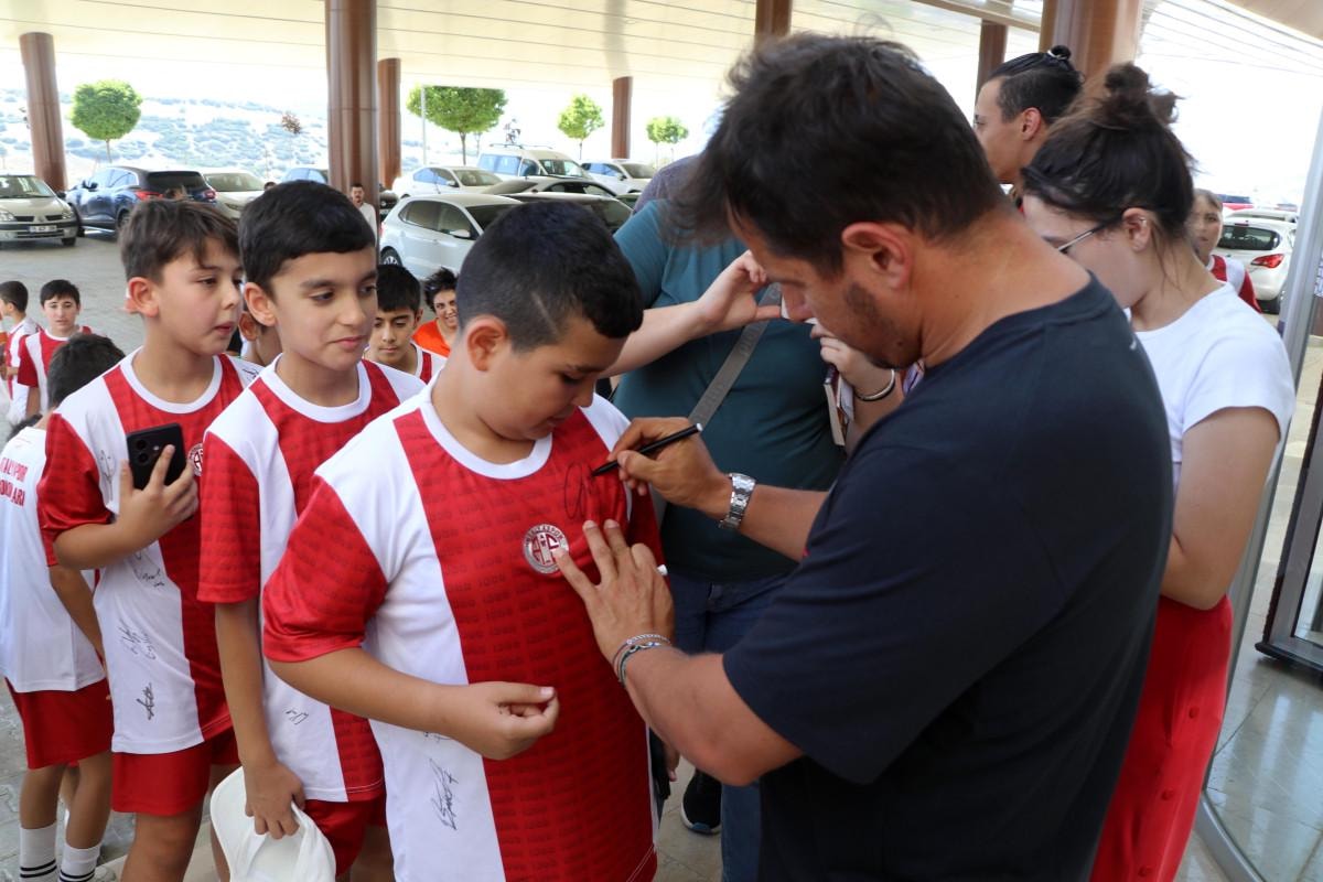Antalyasporlu futbolcular ve teknik direktör Emre Belözoğlu, genç futbolcuların formalarını imzaladı, fotoğraf çektirdi.