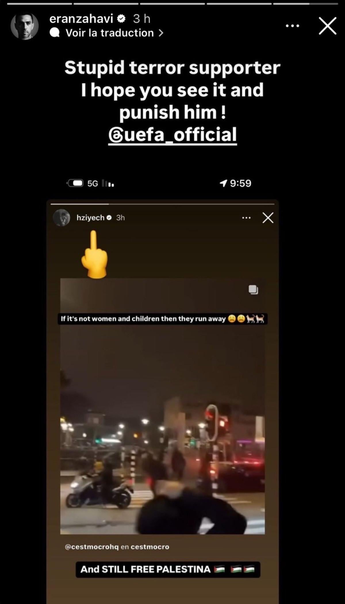 Ziyech'in sosyal medya hesabından yaptığı paylaşımı alıntılayan İsrailli oyuncu, gönderisine UEFA'yı etiketledi ve şu ifadeleri kullandı: