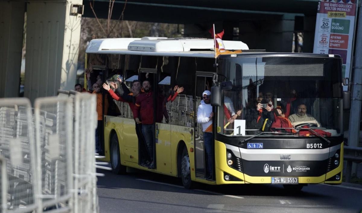 Ali Sami Yen Spor Kompleksi'nde toplanan sarı-kırmızılı taraftarlar, güvenlik aramasının ardından İETT'ye ait otobüslere bindirildi.