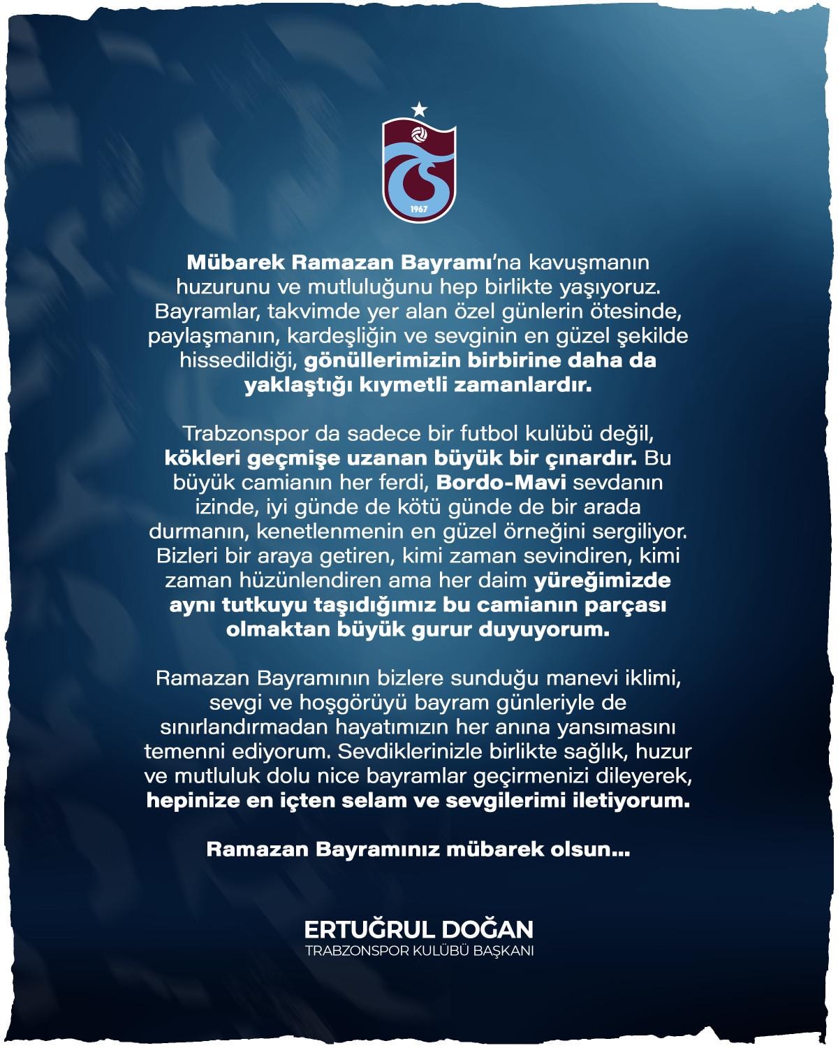 Bu büyük camianın her ferdi, bordo-mavi sevdanın izinde, iyi günde de kötü günde de bir arada durmanın, kenetlenmenin en güzel örneğini sergiliyor. Bizleri bir araya getiren, kimi zaman sevindiren, kimi zaman hüzünlendiren ama her daim yüreğimizde aynı tutkuyu taşıdığımız bu camianın parçası olmaktan büyük gurur duyuyorum. Ramazan Bayramı'nın bizlere sunduğu manevi iklimi, sevgi ve hoşgörüyü bayram günleriyle de sınırlandırmadan hayatımızın her anına yansımasını temenni ediyorum. Sevdiklerinizle birlikte sağlık, huzur ve mutluluk dolu nice bayramlar geçirmenizi dileyerek, hepinize en içten selam ve sevgilerimi iletiyorum.