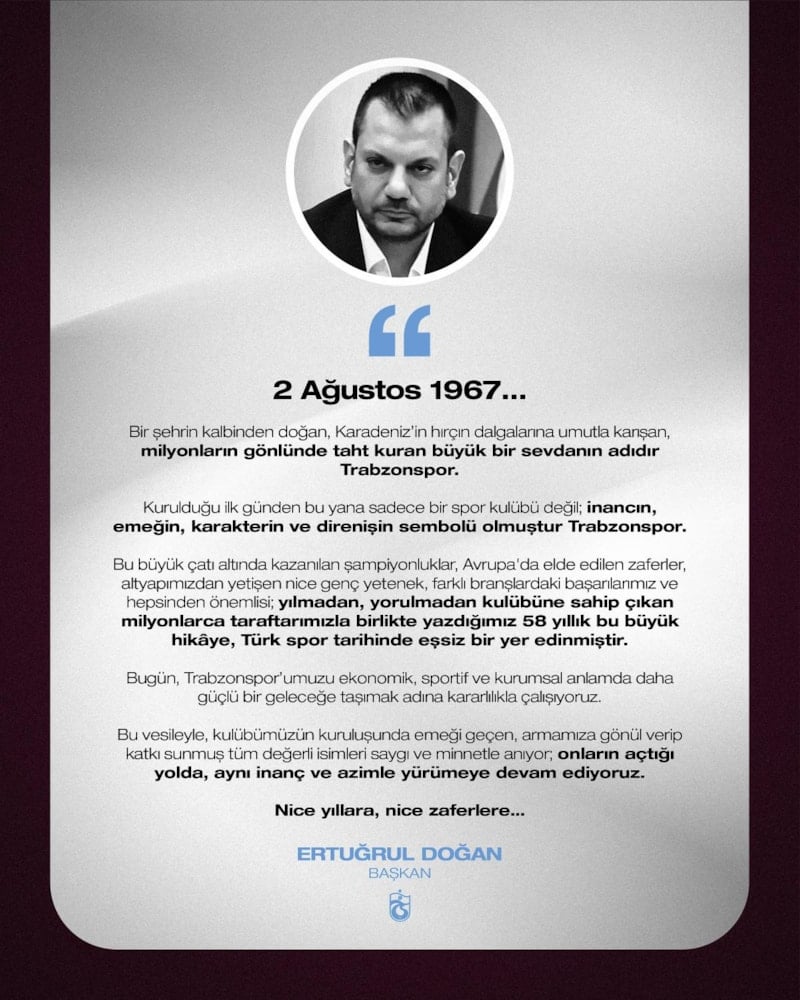 Bu büyük çatı altında kazanılan şampiyonluklar, Avrupa'da elde edilen zaferler, altyapımızdan yetişen nice genç yetenek, farklı branşlardaki başarılarımız ve hepsinden önemlisi yılmadan, yorulmadan kulübüne sahip çıkan milyonlarca taraftarımızla birlikte yazdığımız 58 yıllık bu büyük hikaye Türk spor tarihinde eşsiz bir yer edinmiştir. Bugün, Trabzonspor'umuzu ekonomik, sportif ve kurumsal anlamda daha güçlü bir geleceğe taşımak adına kararlılıkla çalışıyoruz. Bu vesileyle, kulübümüzün kuruluşunda emeği geçen, armamıza gönül verip katkı sunmuş tüm değerli isimleri saygı ve minnetle anıyor, onların açtığı yolda, aynı inanç ve azimle yürümeye devam ediyoruz. Nice yıllara, nice zaferlere.