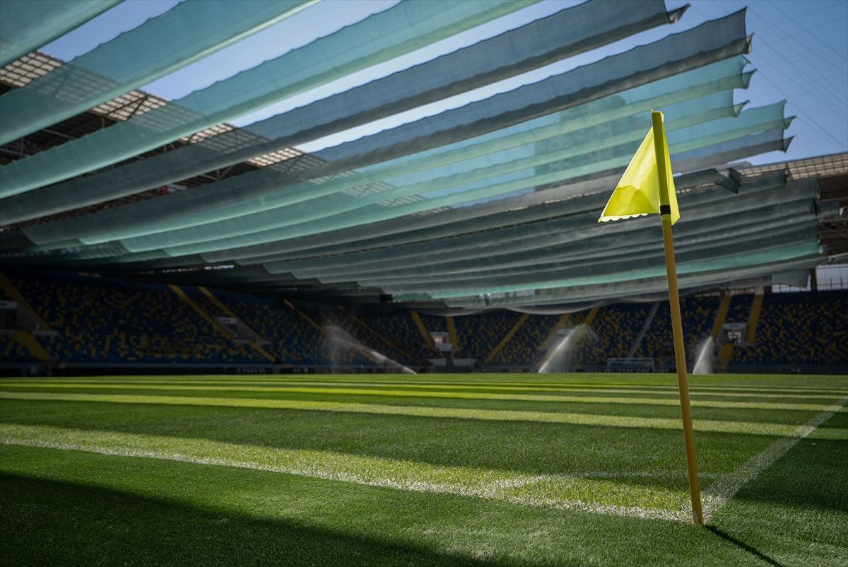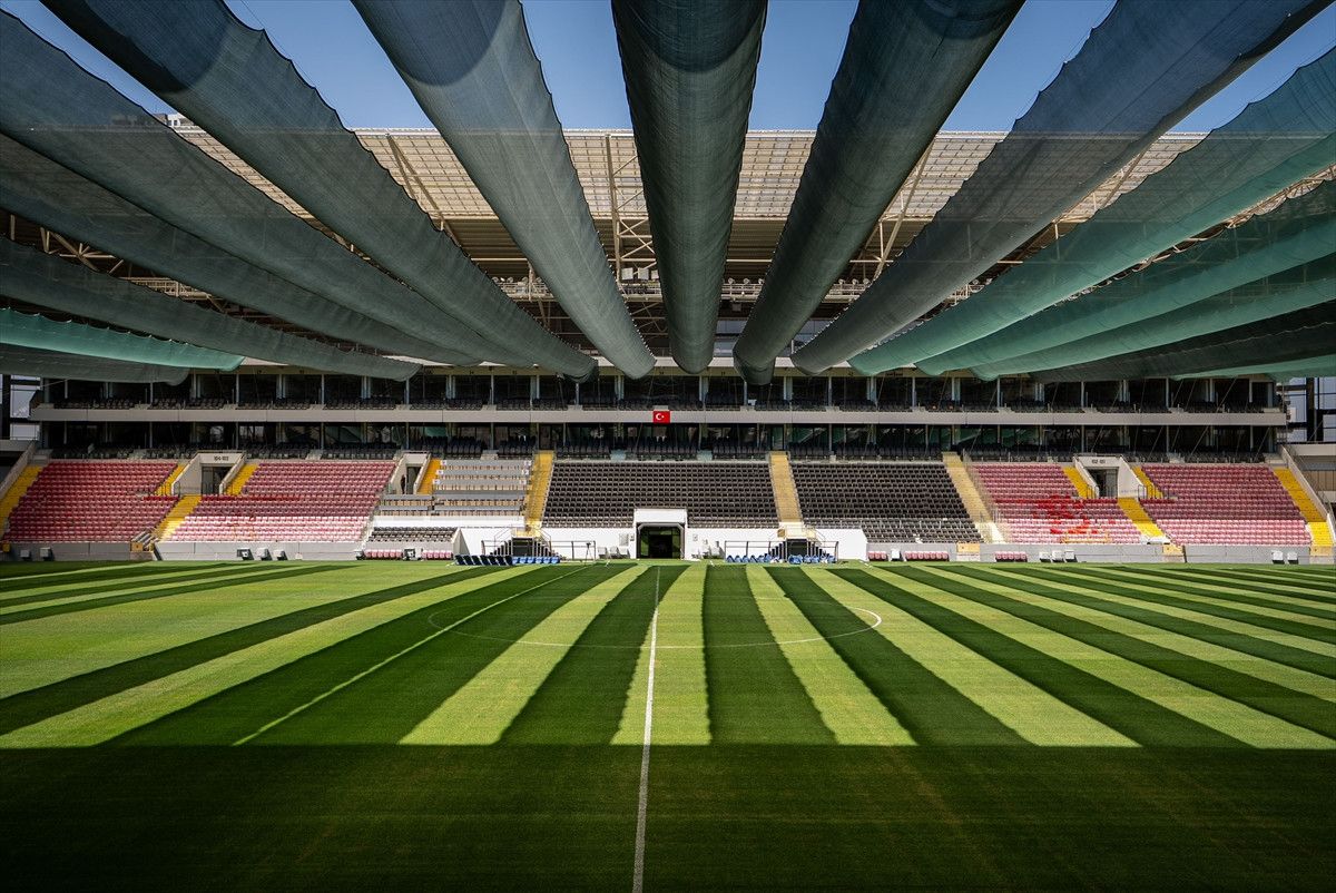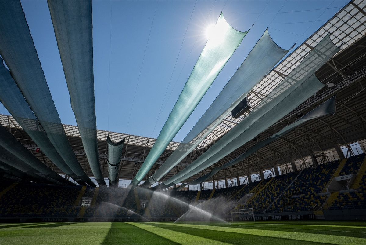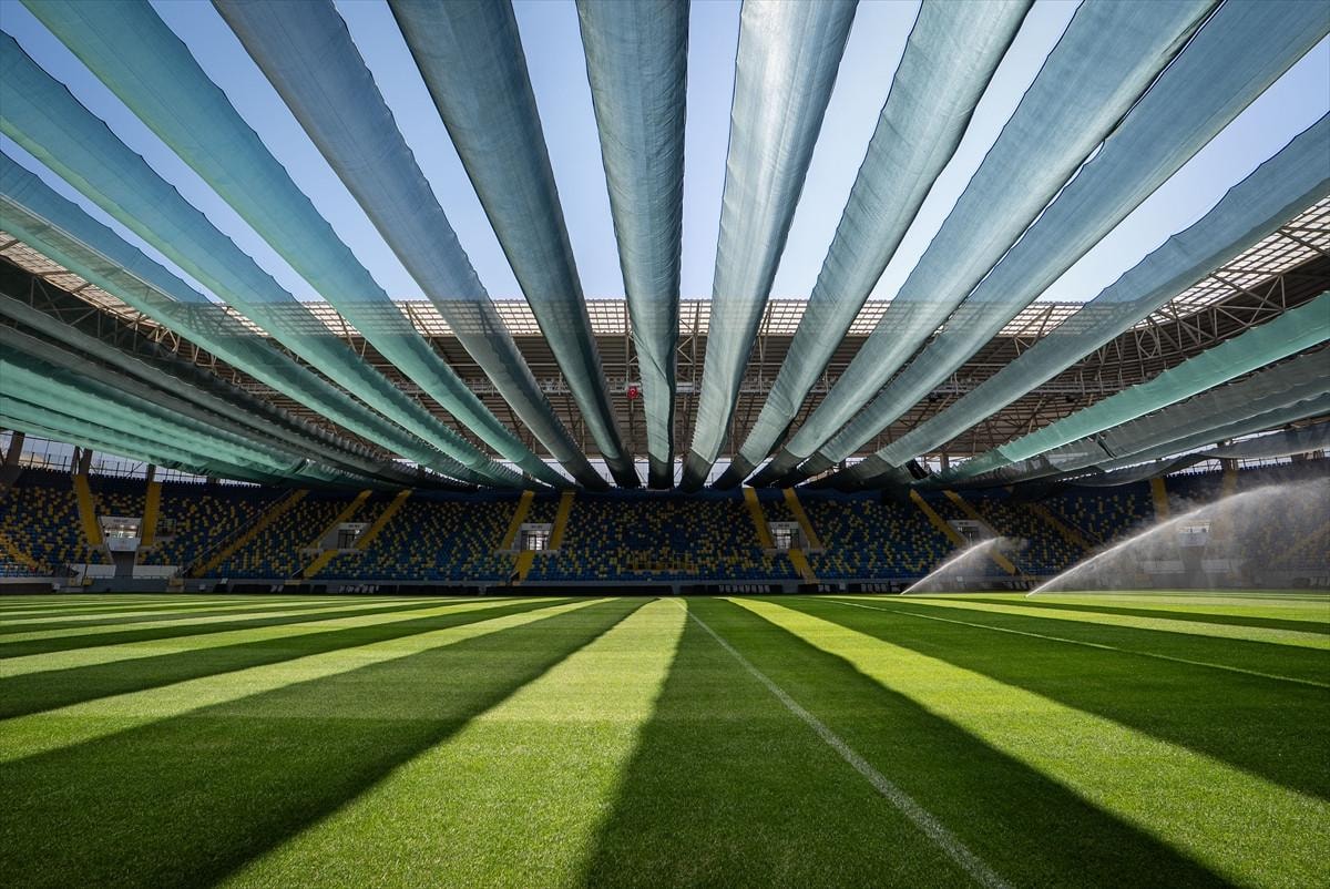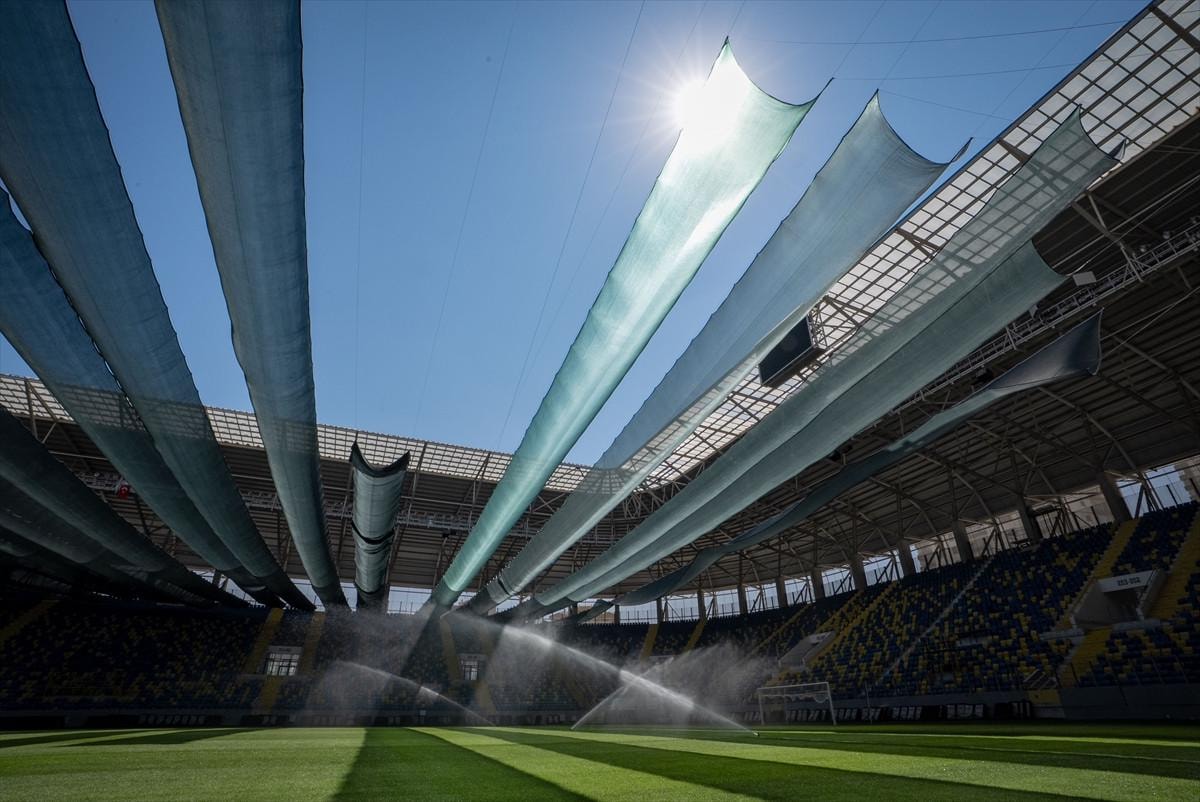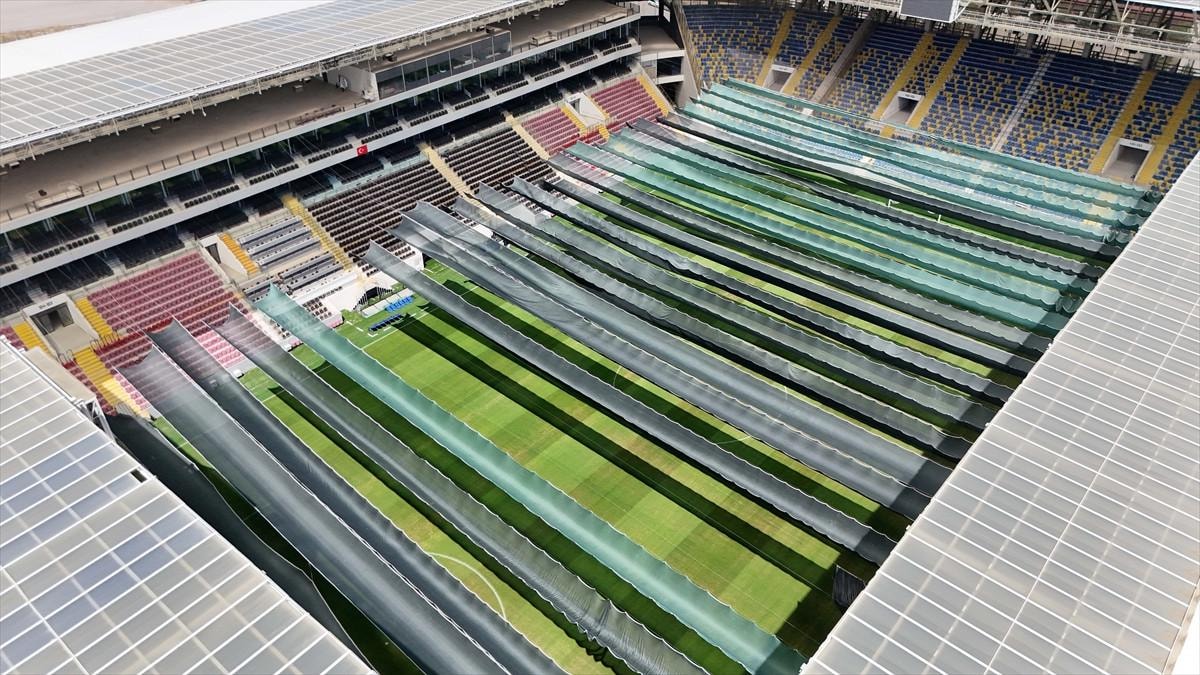 Zeminin korunması ve çimin sağlıklı gelişimini desteklemek amacıyla statta gölgelik sistemi oluşturuldu.