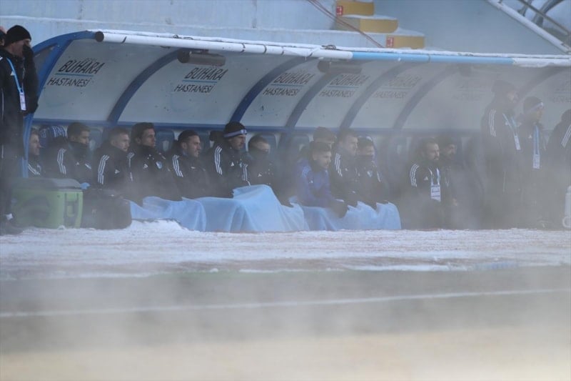 Yedek kulübesindeki futbolcuların ise soğuktan korunmak için battaniyeyle oturması dikkat çekti.