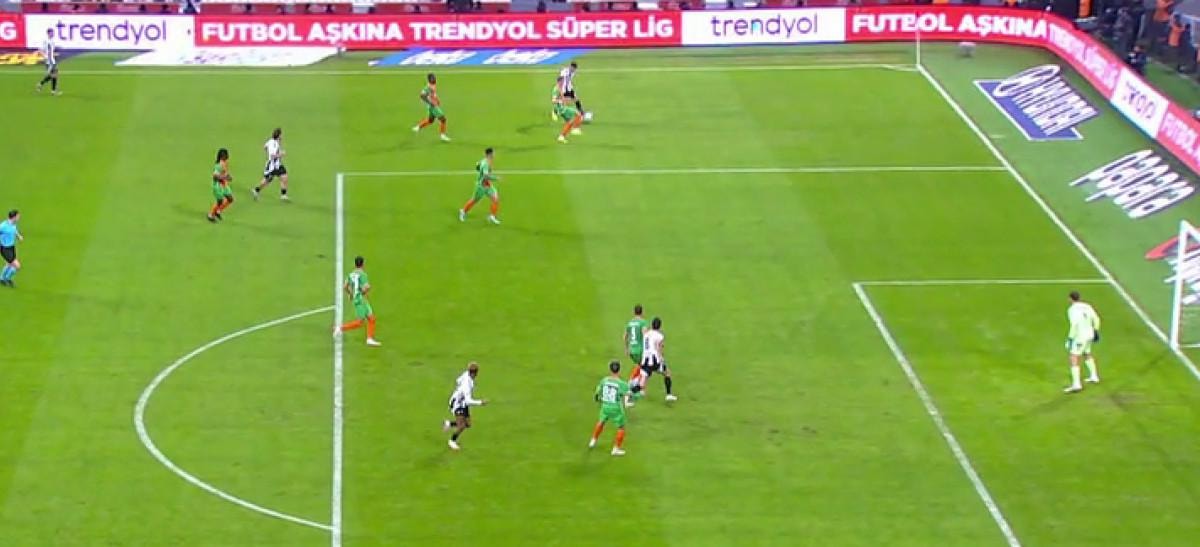 Bahattin Duran: Topla buluşup ortayı yapan Alanyasporlu oyuncu ofsaytta. Sahadaki hakemler devam kararı verdi ama yanlış bir karardı. Burada net bir ofsayt olduğu görülüyor. Üst düzey bir yardımcı hakemin bu tip bir pozisyonu normal şartlarda kaçırmaması gerekir. Burada yardımcı hakem olması gereken yerden biraz önde duruyor. Yan olarak bakması da hata. Yüzü, cephesi sahaya dönük olmalıydı.
