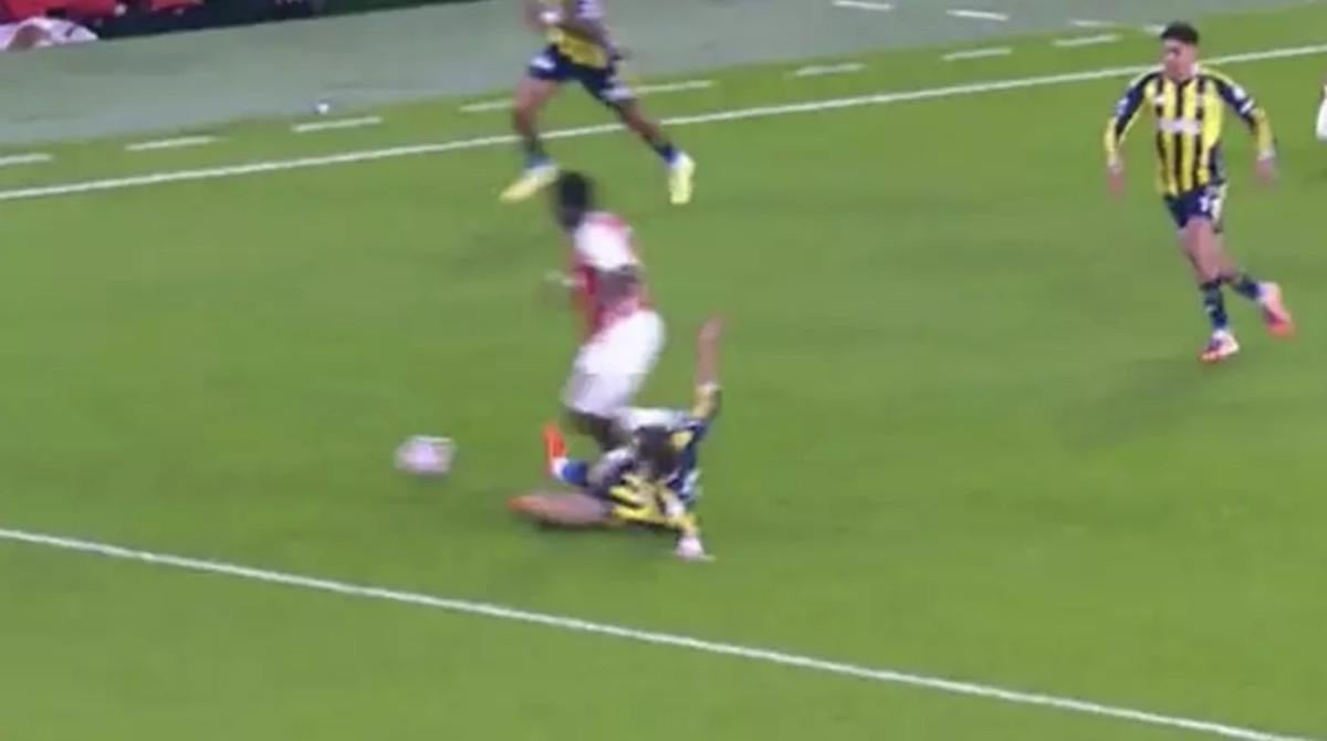 Deniz Çoban: Fenerbahçeli oyuncu, bir önceki oyuncuyu geçerken aldığı darbeyle dengesi bozuluyor. Siz böyle gidip kayarsanız bu ihlaldir. Net bir penaltı. VAR doğru müdahaleyle doğru kararı verdiriyor.