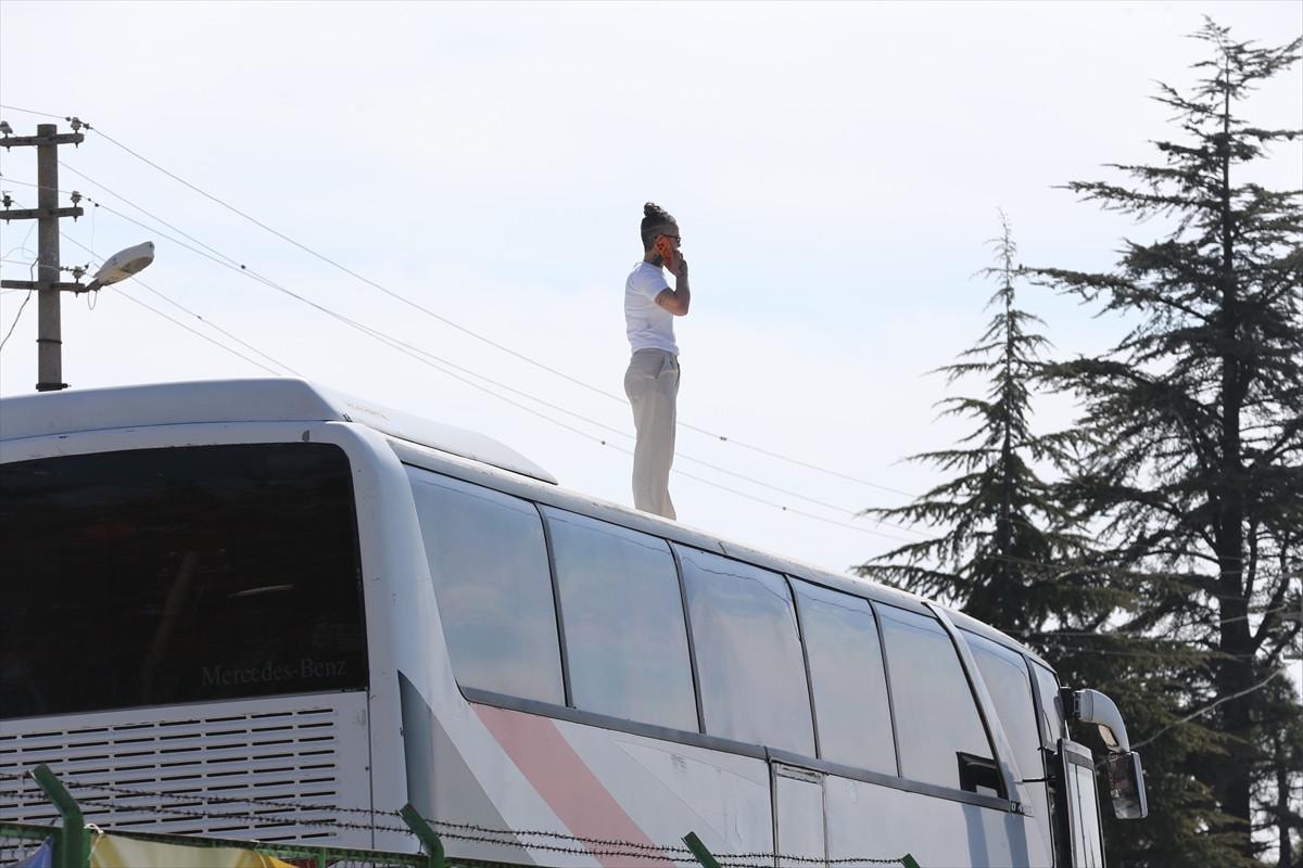 Saha kenarındaki takım otobüsünün üzerine çıkan Konca, buradan oyuncularına taktik verdi.