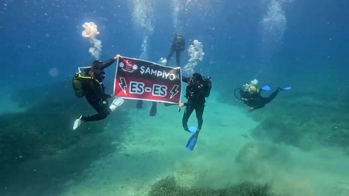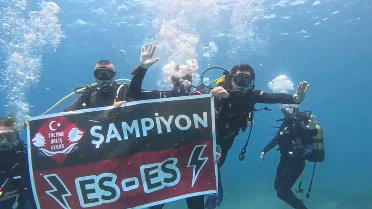 İzmir’in Seferihisar ilçesinde denizin 26 metre derinine dalış gerçekleştiren 7 kişiden oluşan gurup, üzerinde "Şampiyon ES-Es" yazılı pankartı açtı.