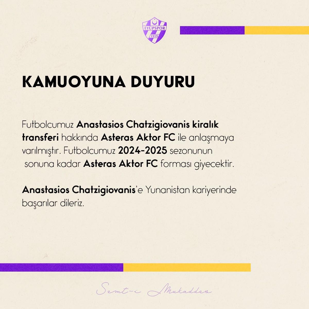 Eyüpspor, futbolcu Anastasios Chatzigiovanis’i sezon sonuna kadar Yunanistan'ın Asteras Aktor ekibine kiraladı.