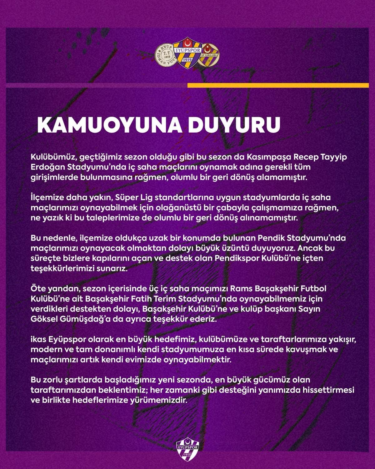 Sezon içerisinde üç iç saha maçımızı Başakşehir Futbol Kulübü'ne ait Başakşehir Fatih Terim Stadyumu'nda oynayabilmemiz için verdikleri destekten dolayı, Başakşehir Kulübü'ne ve kulüp başkanı Sayın Göksel Gümüşdağ'a da ayrıca teşekkür ederiz. Eyüpspor olarak en büyük hedefimiz, kulübümüze ve taraftarlarımıza yakışır, modern ve tam donanımlı kendi stadyumumuza en kısa sürede kavuşmak ve maçlarımızı artık kendi evimizde oynayabilmektir. Bu zorlu şartlarda başladığımız yeni sezonda en büyük gücümüz olan taraftarımızdan beklentimiz her zamanki gibi desteğini yanımızda hissettirmesi ve birlikte hedeflerimize yürümemizdir.