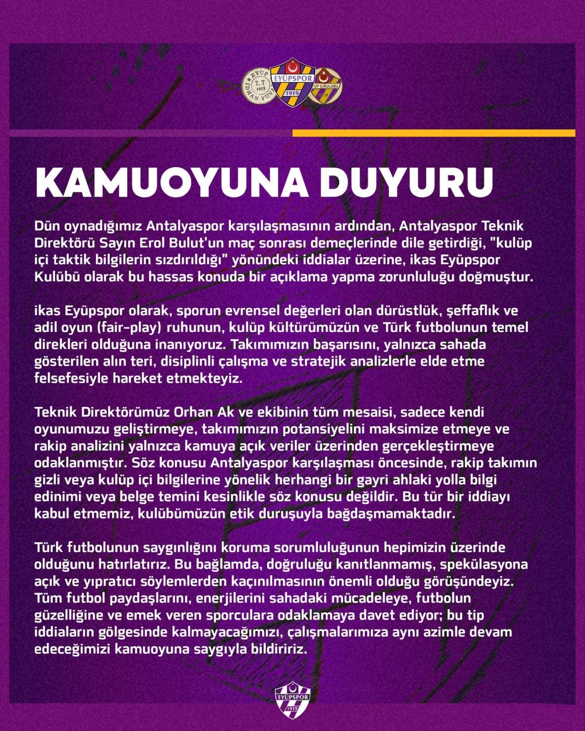 Eyüpspor Kulübü, Eyüpspor-Antalyaspor müsabakasının ardından teknik direktör Erol Bulut'un ortaya attığı iddiaları yalanladı.