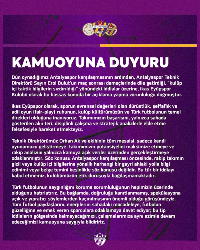 Eyüpspor Kulübü, "Söz konusu Antalyaspor karşılaşması öncesinde, rakip takımın gizli veya kulüp içi bilgilerine yönelik herhangi bir gayriahlaki yolla bilgi edinimi veya belge temini kesinlikle söz konusu değildir" açıklamasını yaptı.