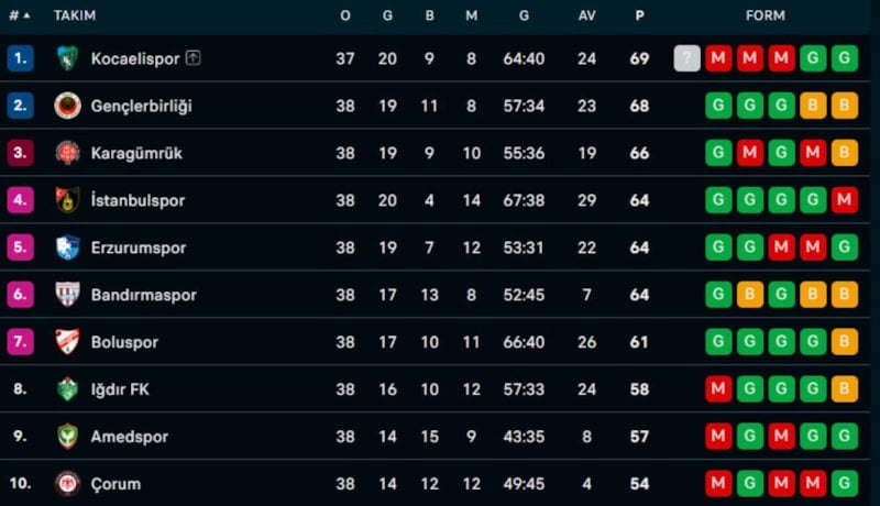 1. LİG'DE PUAN DURUMU