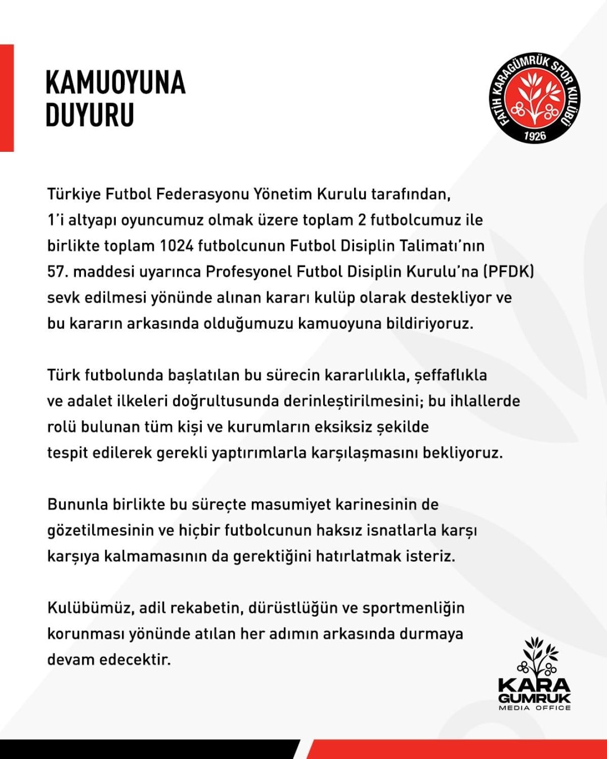 Fatih Karagümrük Spor Kulübü de 1’i altyapı oyuncusu olmak üzere toplam 2 futbolcusunun da PFDK'ya sevk edildiği kararı ve bu süreci desteklediklerini belirten bir açıklama yaptı.