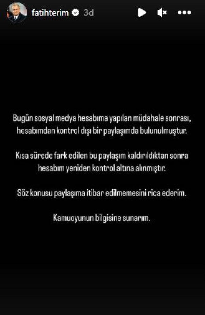 Hocanın eski yardımcısı Necati Ateş konuyla ilgili, "Fatih Terim Hocamın Instagram hesabı hacklenmiştir. Hesabından kontrolü dışında yapılan ve fark edilince silinen paylaşımı dikkate almayınız." ifadelerini kullandı.