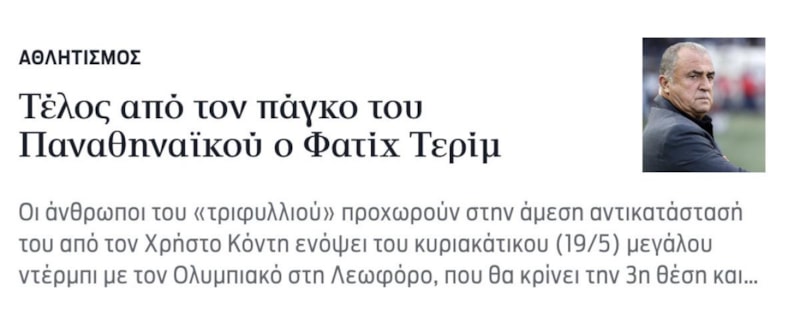Panathinaikos yedek kulübesinden son olarak Fatih Terim ayrıldı. 'Yoncalar' 19 Mayıs Pazar günü Leoforos'ta Olympiakos ile; Yunanistan Kupası finalinde Aris ile oynanacak büyük derbiyi göz önünde bulundurarak onun yerini hemen Christos Contis'e bırakıyor. Play-Off'ların 9'uncu maçında Toumba'da PAOK'a karşı alınan 'ağır' yenilgi Fatih Terim'i çıkış kapısına götürdü.