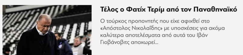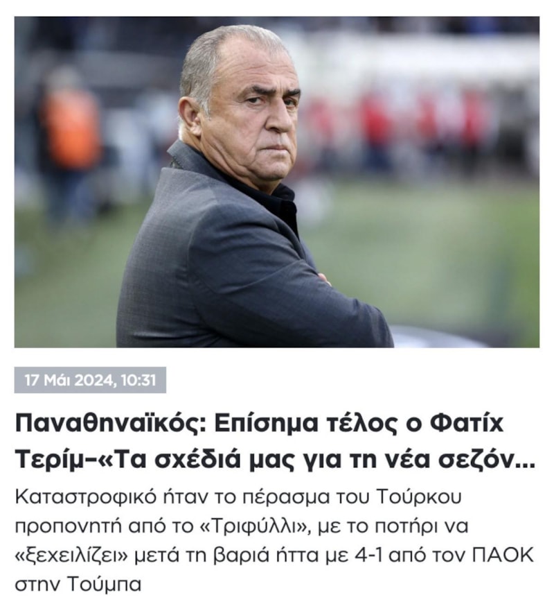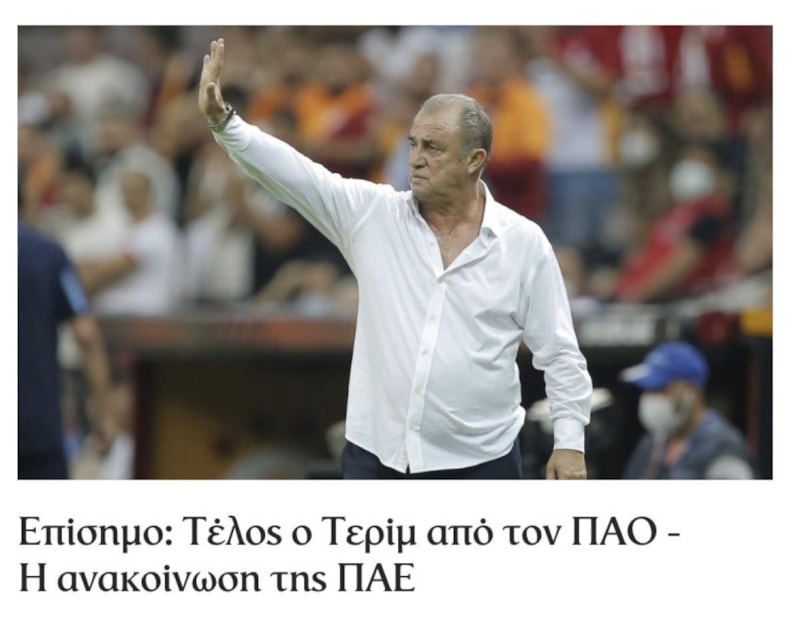 Teknik direktör Fatih Terim, Yunanistan Süper Ligi ekiplerinden Panathinaikos ile yollarını ayırdı. Tecrübeli teknik adamın ayrılığı sonrasında Yunan basını, son dönemdeki kötü sonuçlardan ve PAOK karşısında alınan farklı mağlubiyetten dolayı Terim ile devam edilmediğini aktardı.