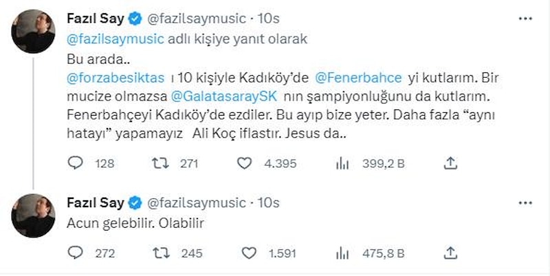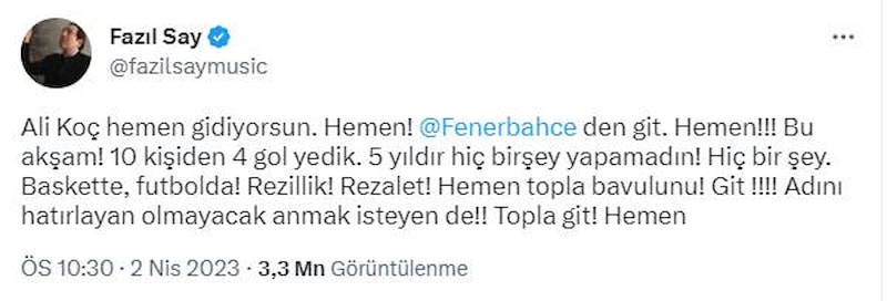 Ünlü sanatçı Fazıl Say, Fenerbahçe'nin Beşiktaş'a 4-2 kaybettiği karşılaşmanın ardından sarı-lacivertli takımın başkanı Ali Koç'a istifa çağrısında bulundu.