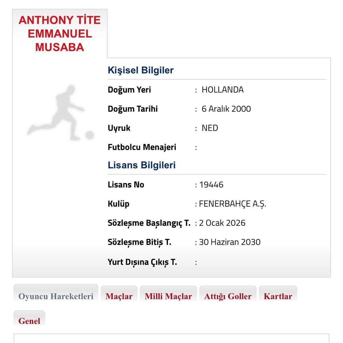 Sarı-lacivertli takımdan Türkiye Futbol Federasyonu'na yapılan bildirimde, Anthony Musaba ile 4.5 yıllık sözleşme imzalandığı belirtildi.