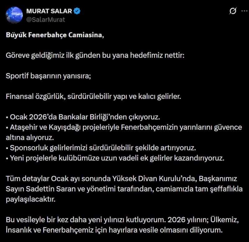 Göreve geldiğimiz ilk günden bu yana hedefimiz nettir: Sportif başarının yanısıra; finansal özgürlük, sürdürülebilir yapı ve kalıcı gelirler. Ocak 2026’da Bankalar Birliği’nden çıkıyoruz. Ataşehir ve Kayışdağı projeleriyle Fenerbahçemizin yarınlarını güvence altına alıyoruz. Sponsorluk gelirlerimizi sürdürülebilir şekilde artırıyoruz. Yeni projelerle kulübümüze uzun vadeli ek gelirler kazandırıyoruz. Tüm detaylar Ocak ayı sonunda Yüksek Divan Kurulu’nda, Başkanımız Sayın Sadettin Saran ve yönetimi tarafından, camiamızla tam şeffaflıkla paylaşılacaktır. Bu vesileyle bir kez daha yeni yılınızı kutluyorum. 2026 yılının; Ülkemiz, İnsanlık ve Fenerbahçemiz için hayırlara vesile olmasını diliyorum.