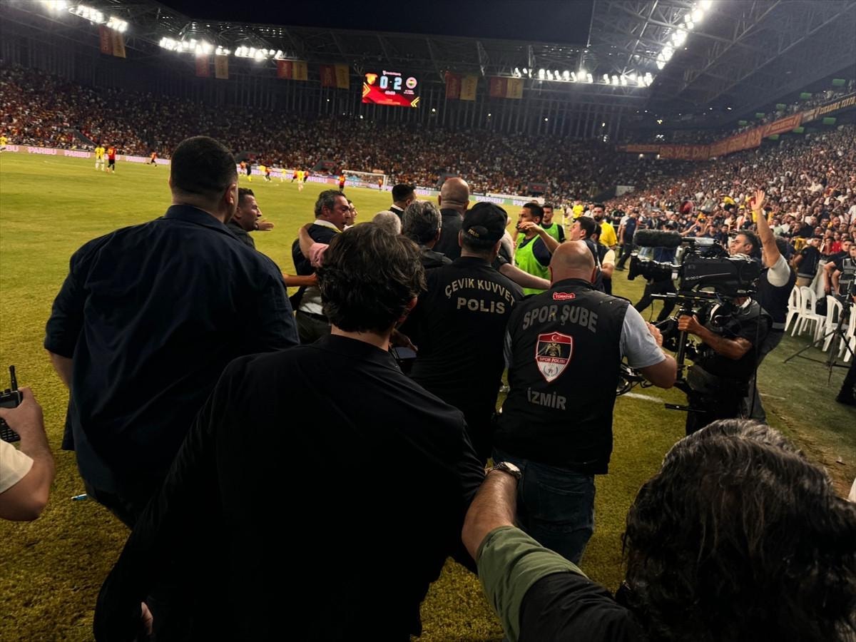 Ali Koç'un taraftarlarla görüşme yaptığı anlarda Göztepe tribünlerinden Ali Koç'a bazı yabancı maddeler atıldı.