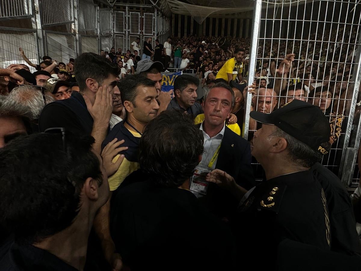 Bazı Fenerbahçeli taraftarların stadyuma girememesi sebebiyle deplasman tribününe yönelen Ali Koç, konu hakkında stadyuma girebilen sarı-lacivertli ile görüştü.