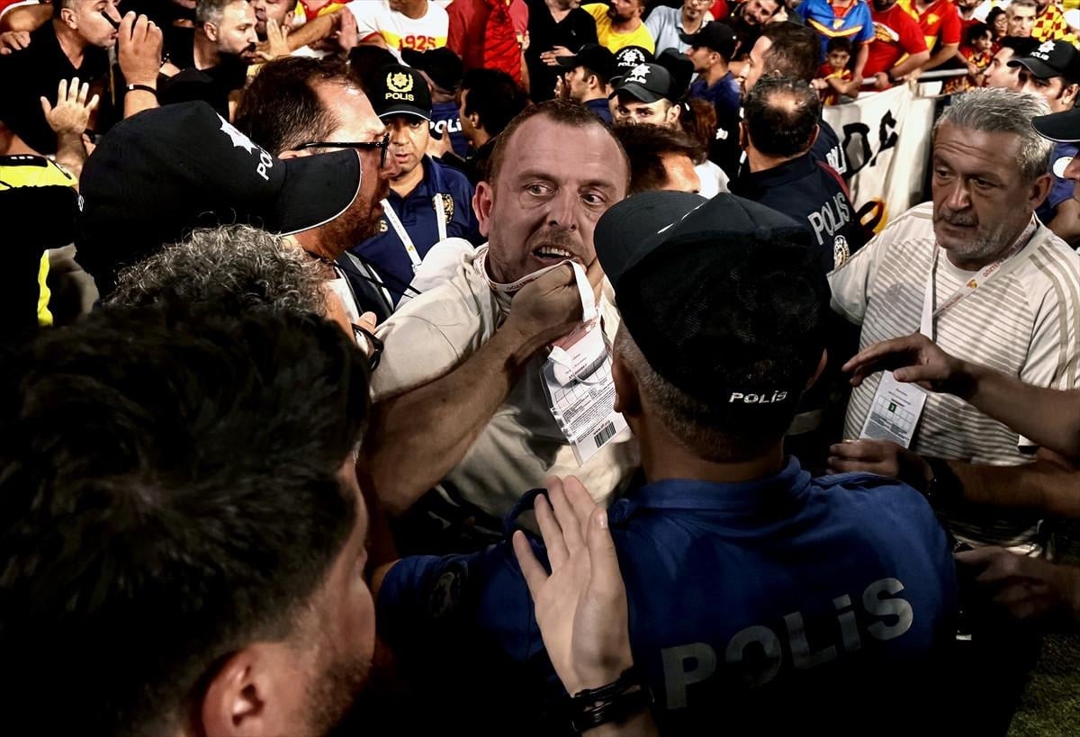 Yoğun güvenlik koruması eşliğinde güney tribünün önünden geçtiği sırada Özkan tarafından fiziksel müdahaleye maruz kalan Ali Koç, bir anda kendini yerde buldu.