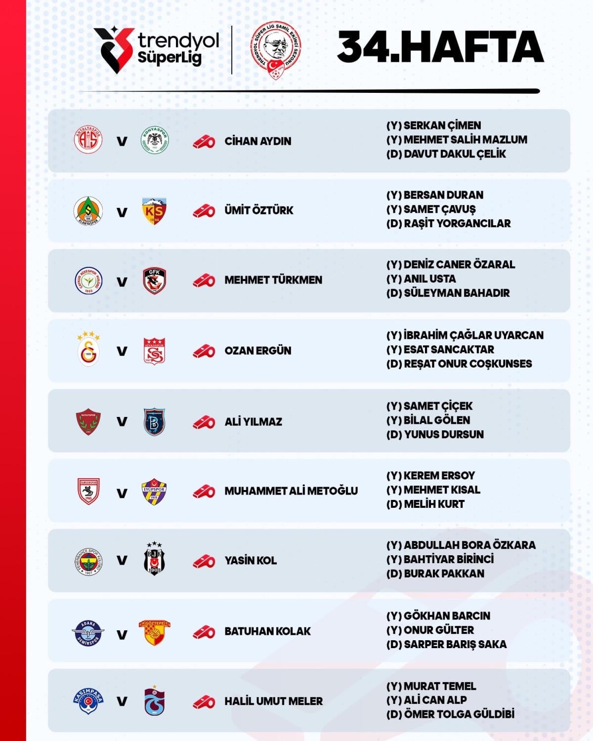 Süper Lig'de 34. haftanın maçlarını yönetecek hakemler belli oldu.