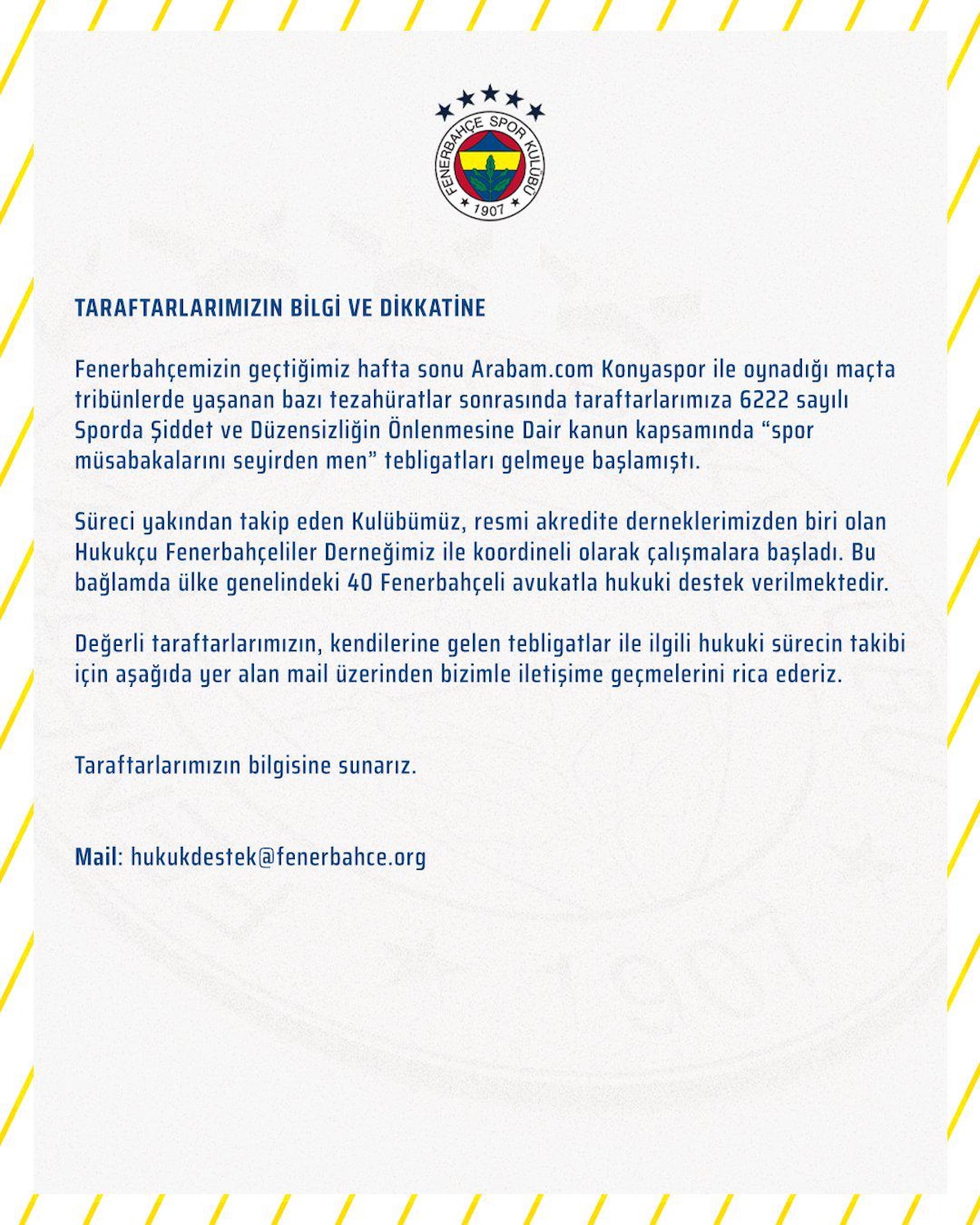 "Fenerbahçemizin geçtiğimiz hafta sonu Arabam.com Konyaspor ile oynadığı maçta tribünlerde yaşanan bazı tezahüratlar sonrasında taraftarlarımıza 6222 sayılı Sporda Şiddet ve Düzensizliğin Önlenmesine Dair kanun kapsamında “spor müsabakalarını seyirden men” tebligatları gelmeye başlamıştı.
