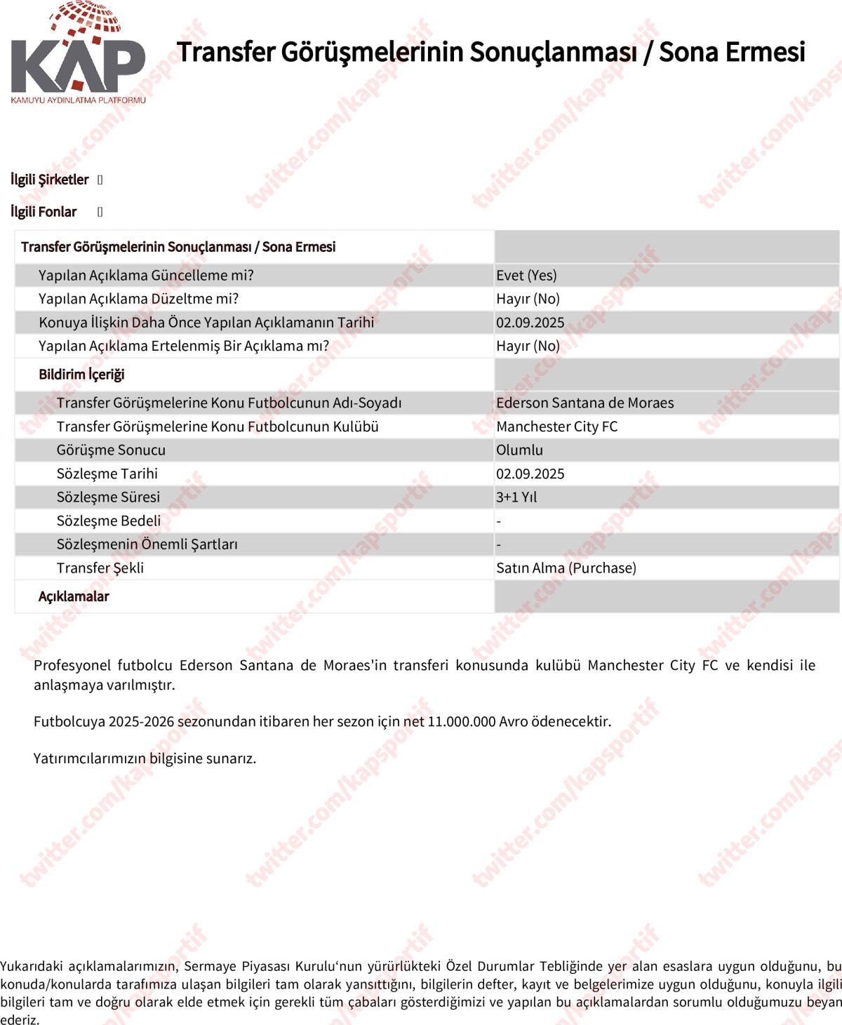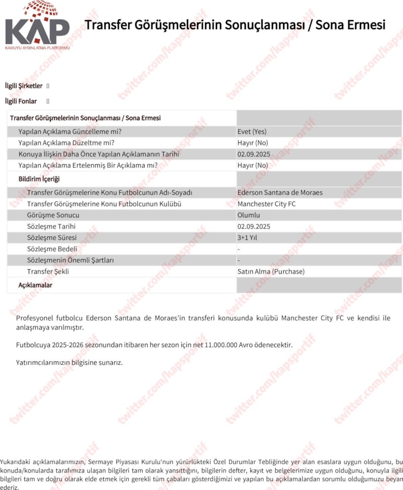 Fenerbahçe'den yapılan açıklamada, "Profesyonel futbolcu Ederson Santana de Moraes'in transferi konusunda kulübü Manchester City FC ve kendisi ile anlaşmaya varılmıştır." Futbolcuya 2025-2026 sezonundan itibaren her sezon için net 11.000.000 euro ödenecek." ifadelerine yer verildi.