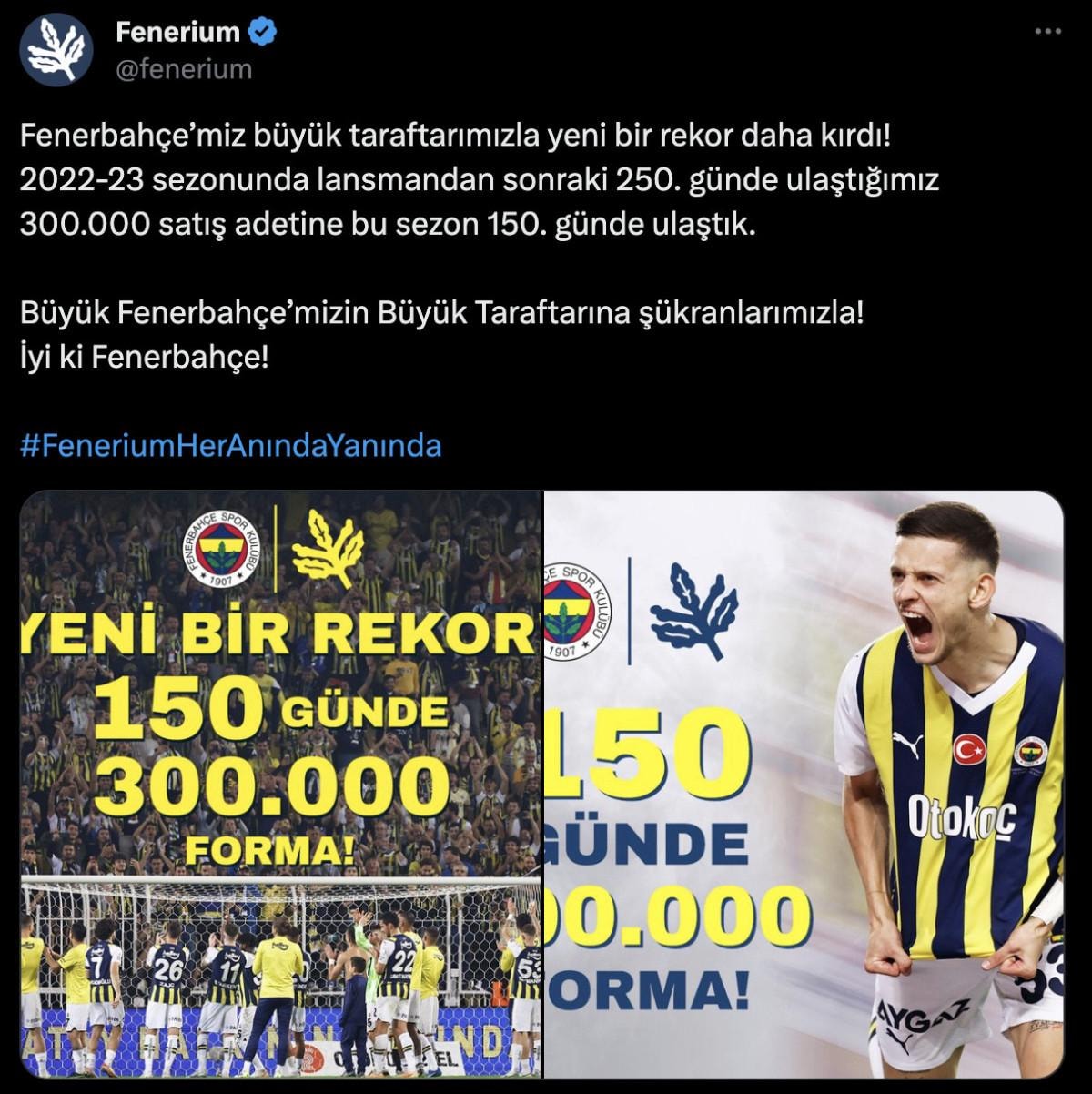 Fenerbahçe’miz büyük taraftarımızla yeni bir rekor daha kırdı! 2022-23 sezonunda lansmandan sonraki 250. günde ulaştığımız 300.000 satış adetine bu sezon 150. günde ulaştık. Büyük Fenerbahçe’mizin Büyük Taraftarına şükranlarımızla! İyi ki Fenerbahçe!