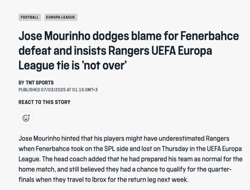 TNT Sport: Jose Mourinho, Fenerbahçe yenilgisinin sorumluluğunu üstlenmedi ve Rangers'la UEFA Avrupa Ligi maçının 'bitmediğini' söyledi.