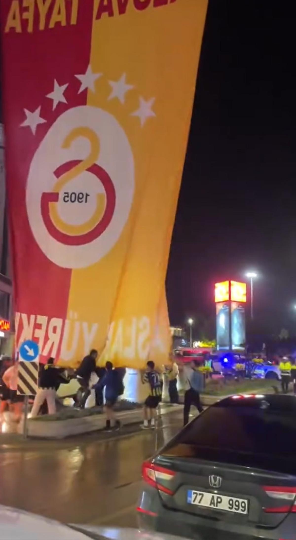 Bazı taraftarlar ise Süper Lig şampiyonluğu sonrası kentin çeşitli yerlerine asılan Galatasaray bayraklarına saldırdı.