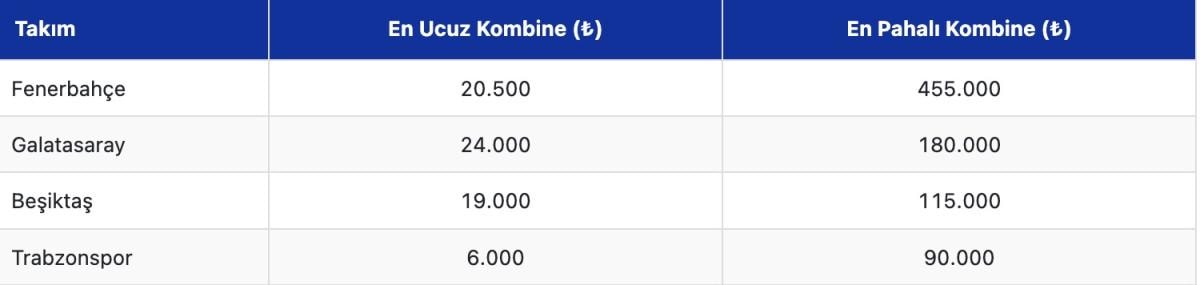 Trendyol Süper Lig'de 2025-2026 sezonunda dört büyüklerin sezonluk (öğrenci, engelli ya da 65 yaş üstü dışında) en ucuz ve en pahalı kombine bilet fiyatları (TL) şu şekilde: