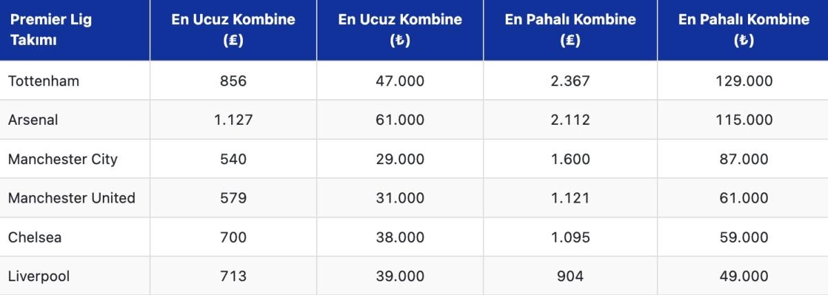 İngiltere Premier Lig'in "Büyük Altılı" olarak adlandırılan dev kulüpleri Arsenal, Chelsea, Liverpool, Manchester City, Manchester United ve Tottenham'ın en pahalı kombine bilet fiyatları bile Fenerbahçe ve Galatasaray'dan düşük kaldı.