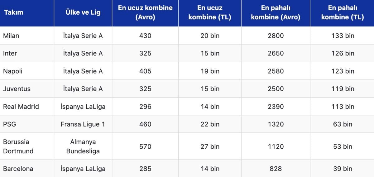 Galatasaray'ın en pahalı kombine fiyatı ise 180 bin lira olurken, sarı-kırmızılılar, Fenerbahçe'den sonra Avrupa'da 2. sırada yer aldı.
