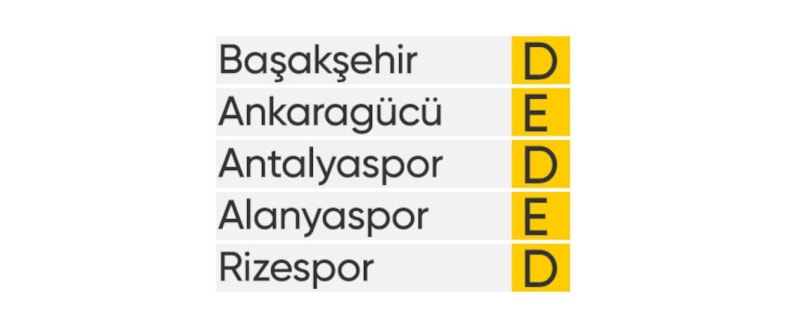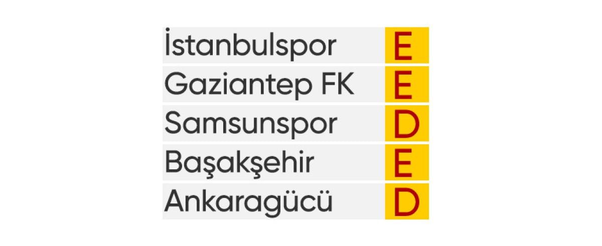 Fenerbahçe'nin 5 haftalık fikstürü şu şekilde: (E: Ev Sahibi - D: Deplasman)