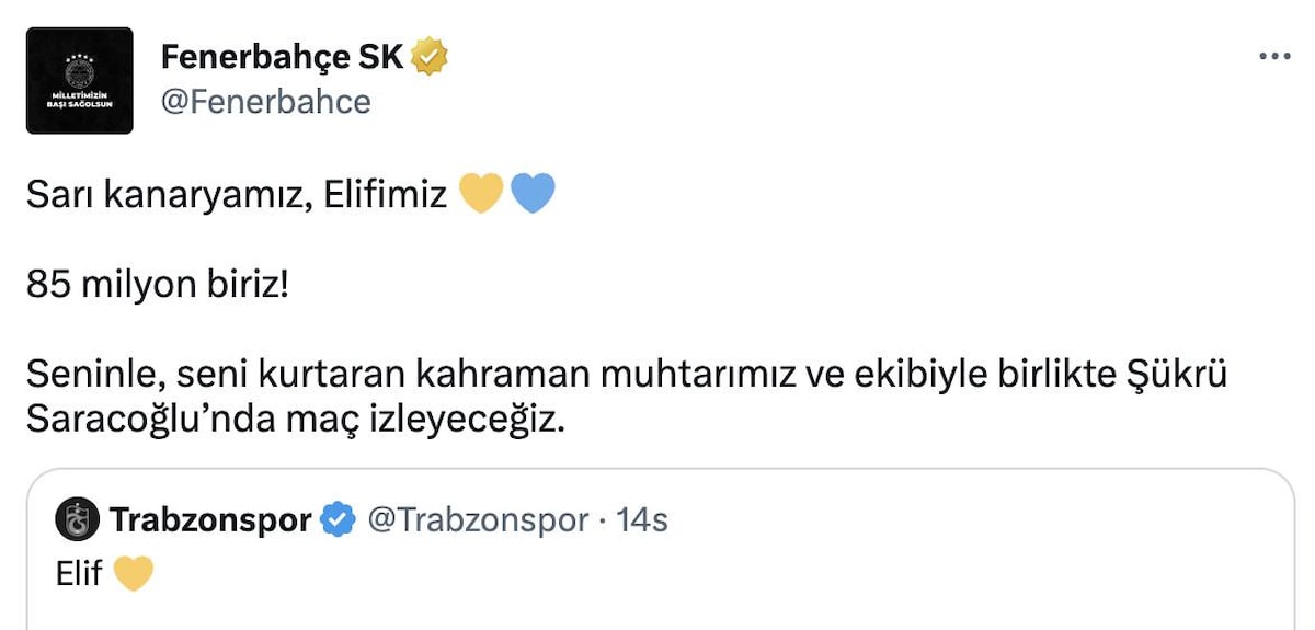 "Sarı kanaryamız, Elifimiz 85 milyon biriz! Seninle, seni kurtaran kahraman muhtarımız ve ekibiyle birlikte Şükrü Saracoğlu’nda maç izleyeceğiz."