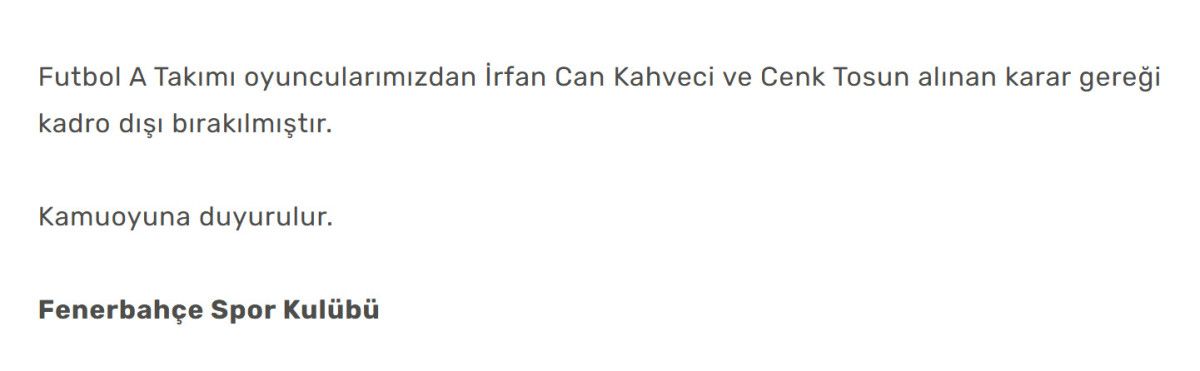 Fenerbahçe, milli futbolcular İrfan Can Kahveci ve Cenk Tosun'un alınan karar gereği kadro dışı bırakıldığını duyurdu.