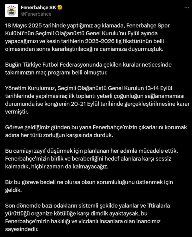18 Mayıs 2025 tarihinde yaptığımız açıklamada, Fenerbahçe Spor Kulübü’nün Seçimli Olağanüstü Genel Kurulu’nu Eylül ayında yapacağımızı ve kesin tarihlerin 2025-2026 lig fikstürünün belli olmasından sonra kararlaştırılacağını camiamıza duyurmuştuk.