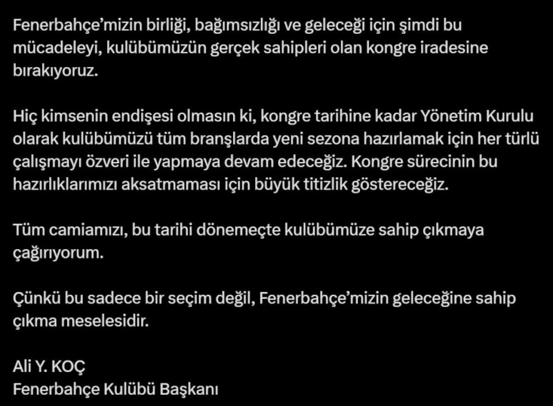 Fenerbahçe’mizin birliği, bağımsızlığı ve geleceği için şimdi bu mücadeleyi, kulübümüzün gerçek sahipleri olan kongre iradesine bırakıyoruz.