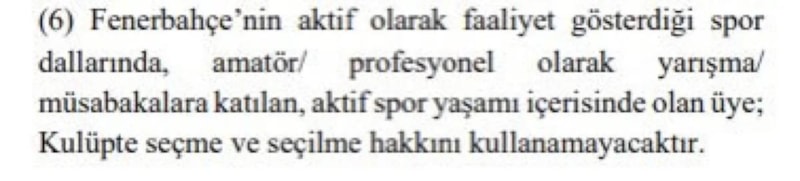 Tüzükte yer alan 15. maddenin 6. fıkrasında, "F.Bahçe'nin aktif olarak faaliyet gösterdiği spor dallarında, amatör/ profesyonel olarak yarışma/müsabakalara katılan, aktif spor yaşamı içerisinde olan üye; kulüpte seçme ve seçilme hakkını kullanamayacaktır." ifadeleri yer alıyor.