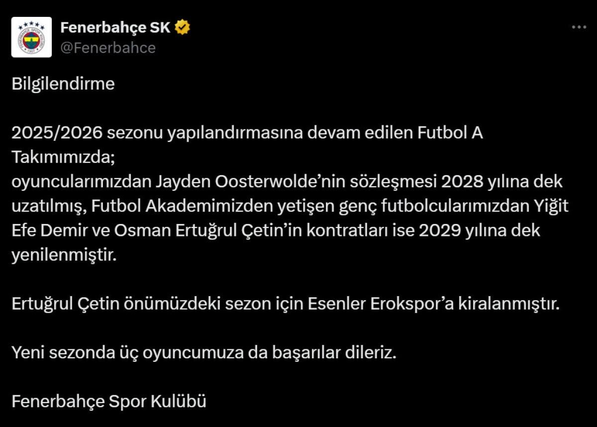 Fenerbahçe, Jayden Oosterwolde, Yiğit Efe Demir ve Ertuğrul Çetin'in sözleşmelerinin uzatıldığını ve Ertuğrul'un Erokspor'a kiralandığını açıkladı.