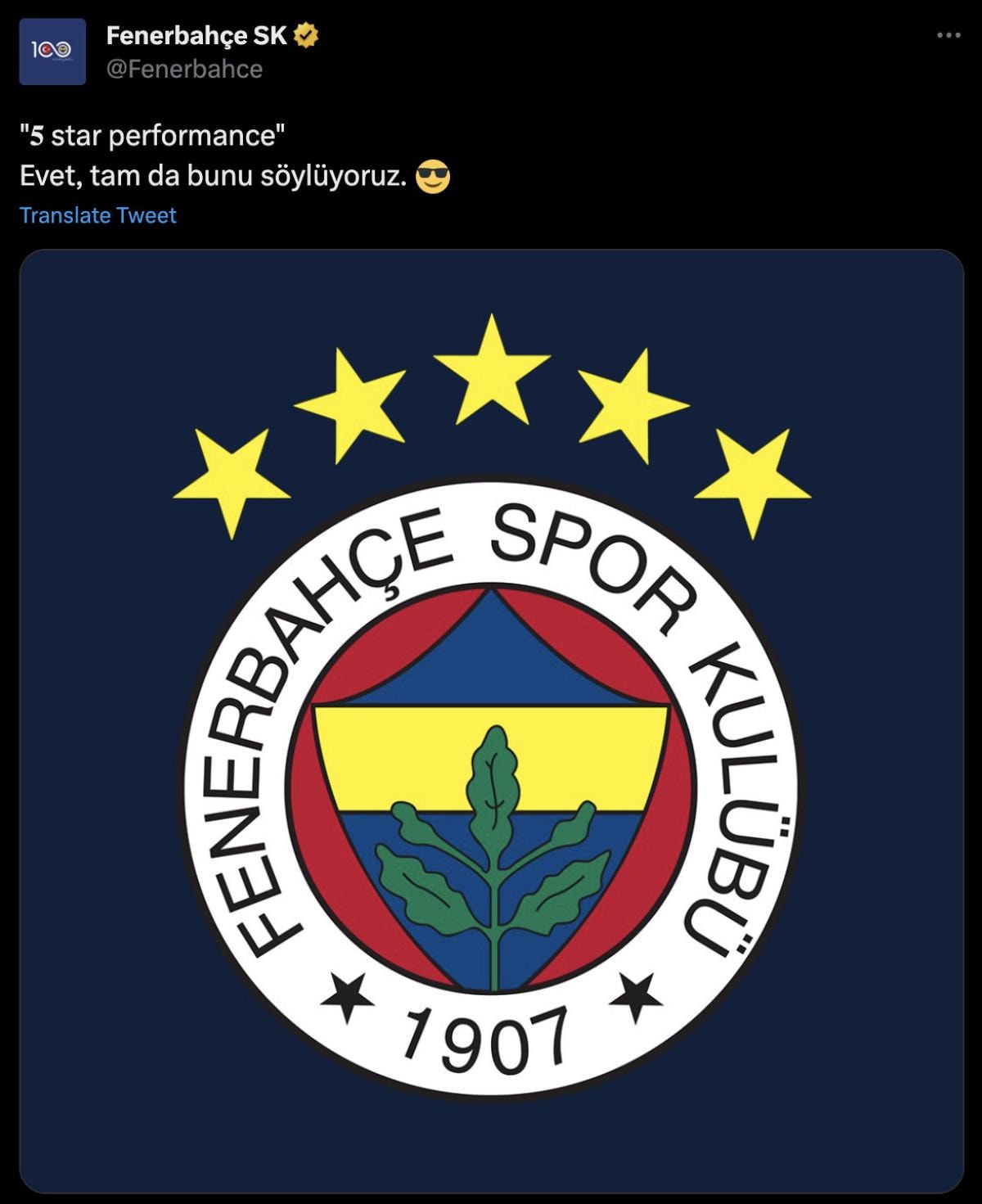 Sarı-lacivertli takım da bu gönderiyi alıntılayarak, "5 star performance Evet tam da bunu söylüyoruz" ifadelerinin yer aldığı bir paylaşım yaptı. Aynı zamanda bu paylaşımda 5 yıldızlı amblemin kullanılması dikkatlerden kaçmadı.