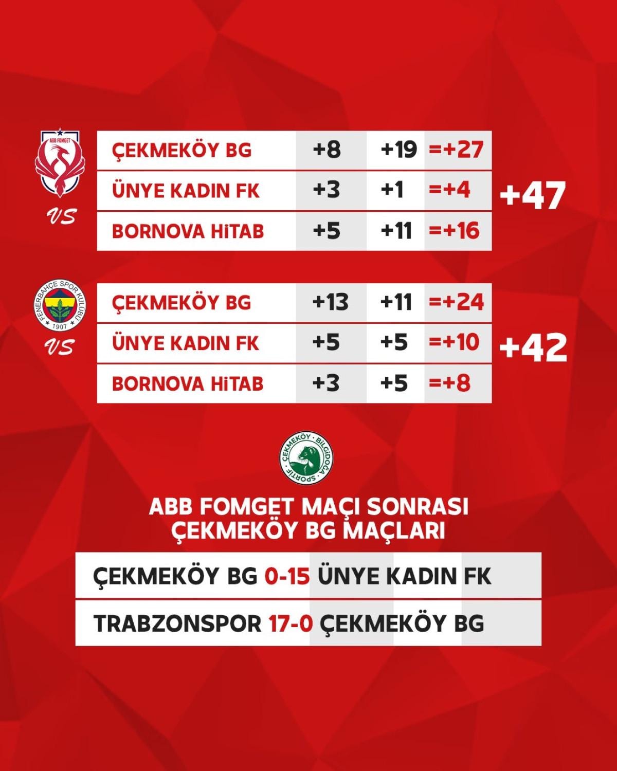 Fenerbahçe açıklamasında ABB Fomget'in 22. haftada 19-0 kazandığı Çekmeköy Bilgidoğa maçının yanı sıra bugün oynanan ve başkent ekibinin Bornova Hitabspor'u 12-1 yendiği karşılaşmada alınan sonuçların 'hayatın olağan akışına aykırı' olduğu savunuldu.