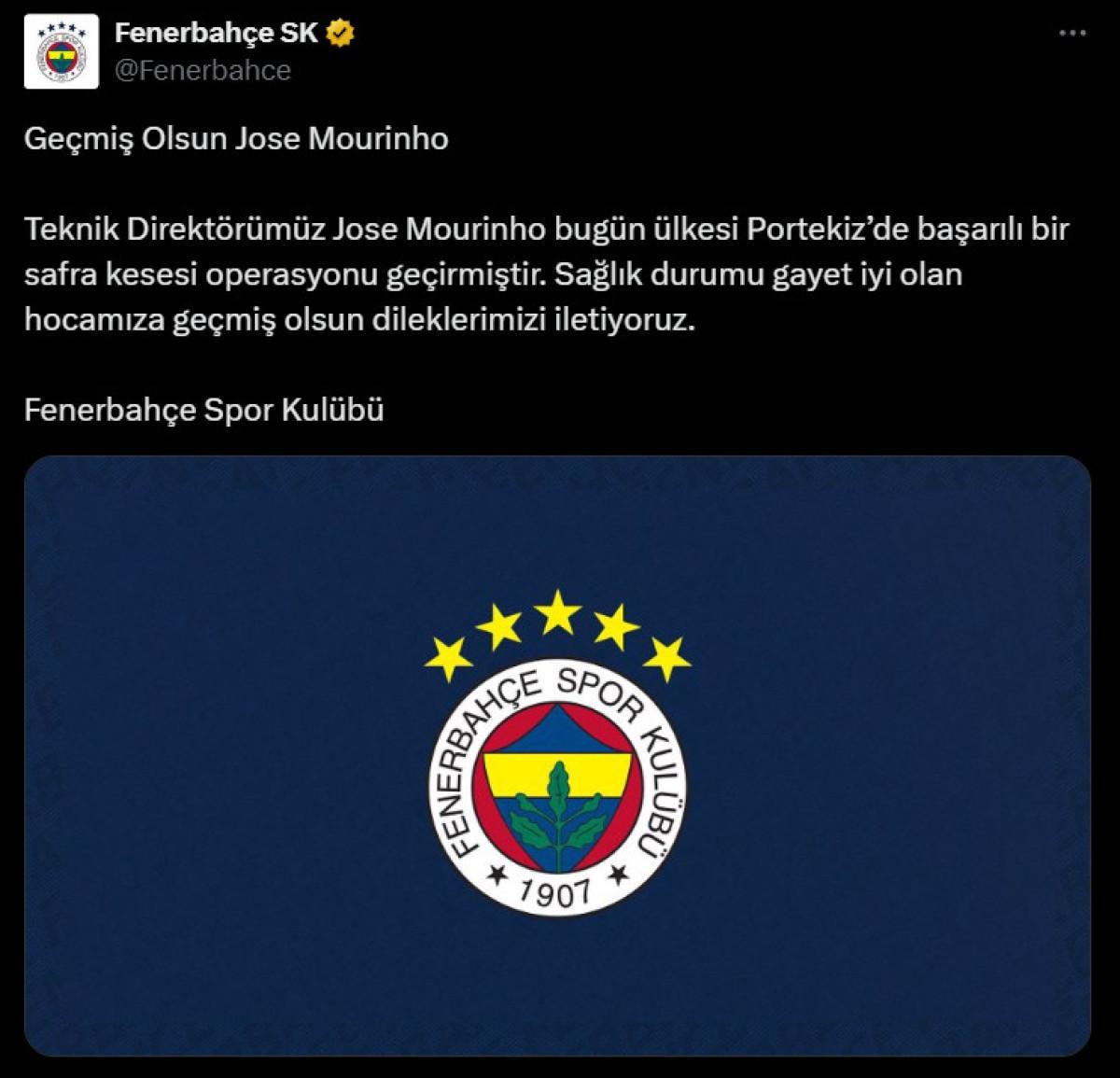 Dünyaca ünlü teknik adam hakkında yeni bir gelişme yaşandı. Fenerbahçe Kulübü, resmi hesabından yaptığı açıklamayla Mourinho'nun bugün ülkesi Portekiz'de başarılı bir safra kesesi operasyonu geçirdiğini duyurdu.