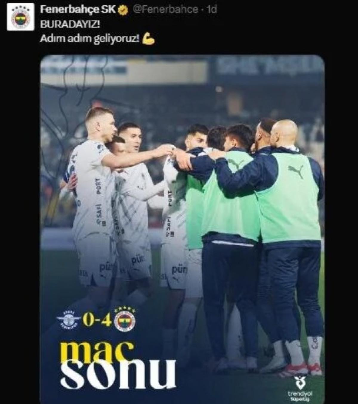 Puanını 45 yapan ve Galatasaray ile arasındaki puan farkını 6'ya düşüren Fenerbahçe'nin bu paylaşımı, sarı-lacivertli taraftarlar tarafından büyük beğeni topladı.