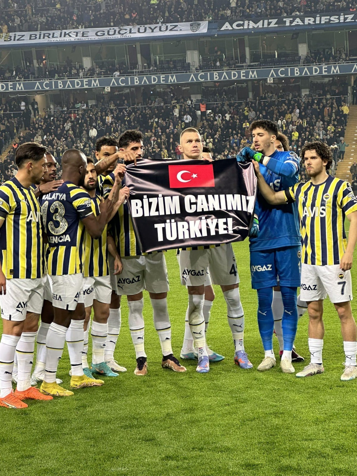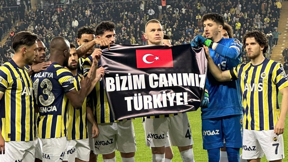 Fenerbahçe'de topun başına geçen Valencia, penaltıdan attığı golle takımını öne geçirdi. Golün ardından Fenerbahçeli oyuncular, "Bizim canımız Türkiye" pankartıyla poz verdi.