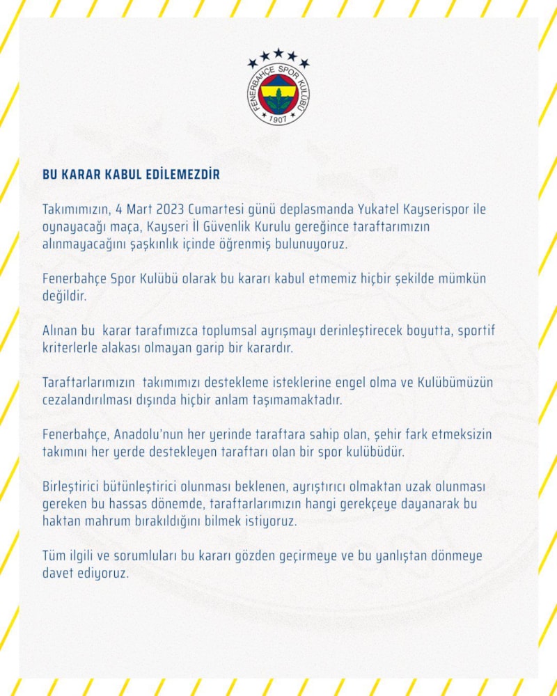 Takımımızın, 4 Mart 2023 Cumartesi günü deplasmanda Yukatel Kayserispor ile oynayacağı maça, Kayseri İl Güvenlik Kurulu gereğince taraftarımızın alınmayacağını şaşkınlık içinde öğrenmiş bulunuyoruz.
