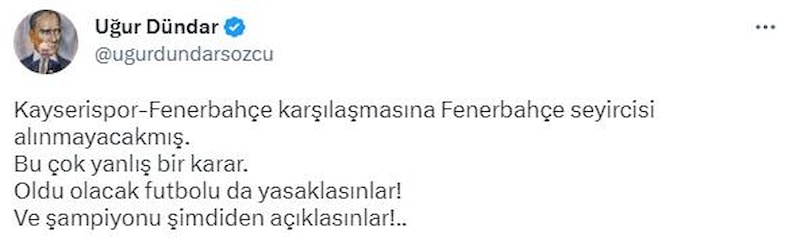 "Kayserispor-Fenerbahçe karşılaşmasına Fenerbahçe seyircisi alınmayacakmış. Bu çok yanlış bir karar. Oldu olacak futbolu da yasaklasınlar! Ve şampiyonu şimdiden açıklasınlar!.."